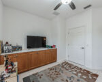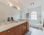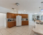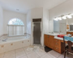 The master suite offers unparalleled comfort with Jack and Jill walk-in closets, separate bathroom vanities, and a generously sized jetted tub, creating a serene home spa ambiance. The main living area features tiled flooring throughout the kitchen and living room, accentuating the bright and open floor plan. The expansive kitchen is equipped with ample cabinet space, a breakfast bar area, and a separate dining space.
